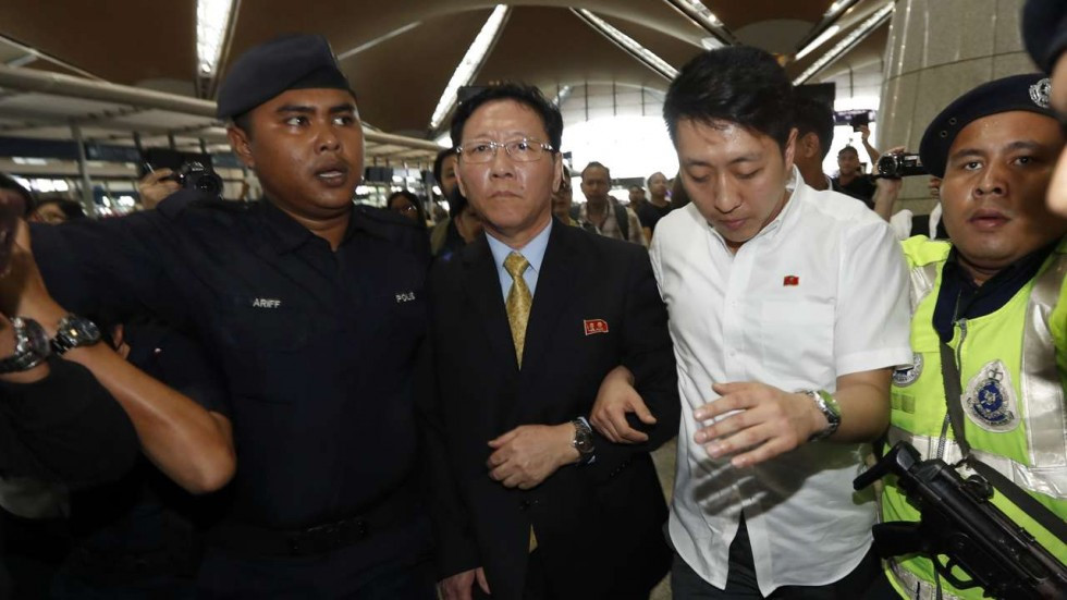 Kim Chang, cựu đại sứ Triều Tiên tại Malaysia, được hộ tống ra sân bay Kuala Lumpur trở về nước. Ảnh: AP.