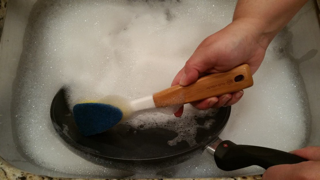 Rửa chảo chống dính bằng miếng bọt biển.