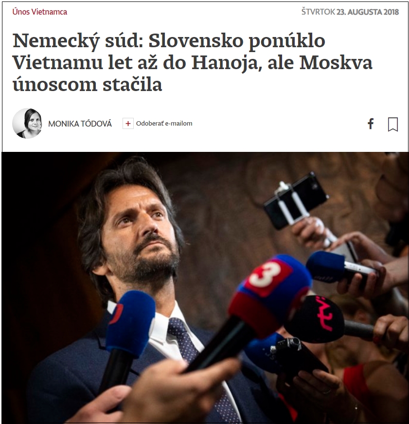 Slovakia ngỏ ý cung cấp cho một phái đoàn Việt Nam chiếc chuyên cơ của chính phủ để bay về tận Hà Nội. Nhật báo Dennik N của Slovakia đã được một phát phát ngôn viên của một tòa án Đức viết trả lời như thế. Đó là Tòa án Berlin mà cách đây vài tuần đã kết án bị cáo Nguyễn Hải Long, một trong những can phạm tham gia vụ bắt cóc Trịnh Xuân Thanh tại Berlin.
