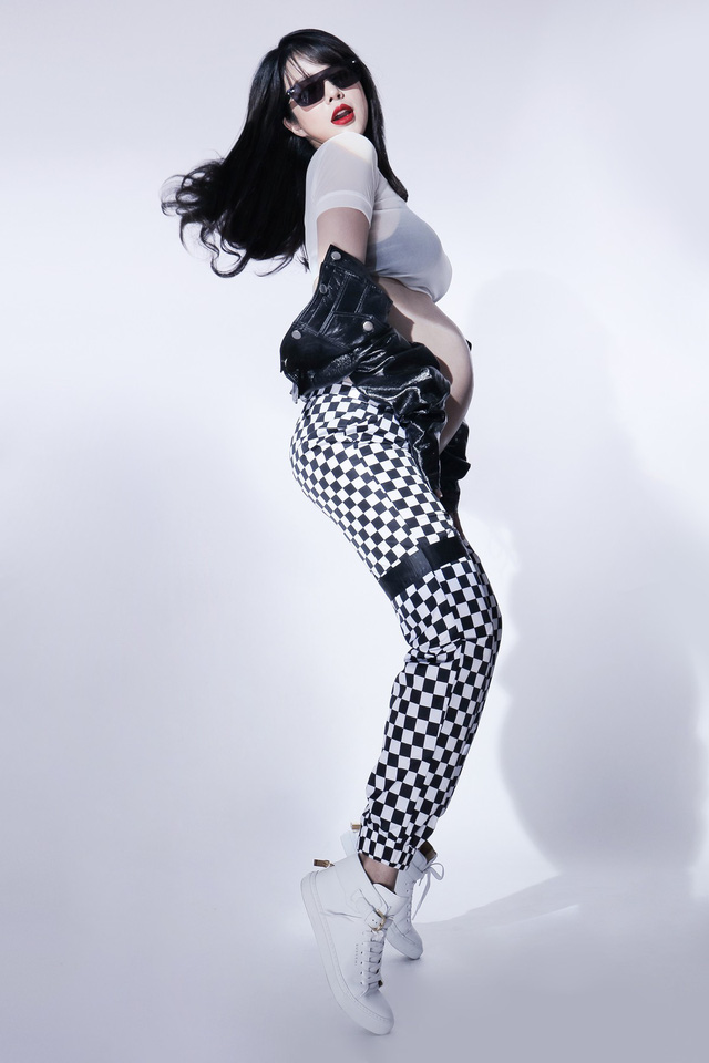 Dù bụng bầu vượt mặt nhưng quán quân Cuộc đua kỳ thú 2013 vẫn tự tin mặc đồ ôm sát, và lựa chọn style theo một phong cách riêng biệt. Không ít khán giả cho rằng cô chính là bà bầu chất và ngầu nhất Vbiz hiện nay.