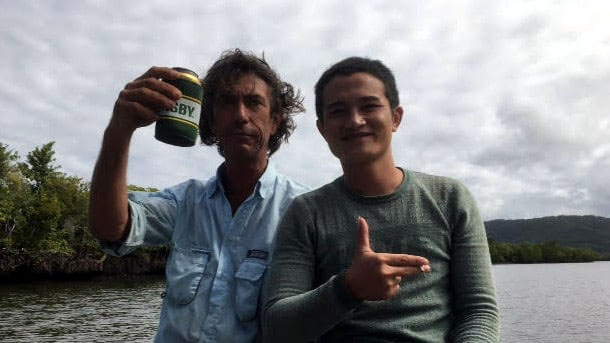 Ông Justin Ward chia sẻ một lon bia, một điếu thuốc lá với một anh Việt được giấu tên, khi họ đi câu cua trên một con sông có nhiều cá sấu.