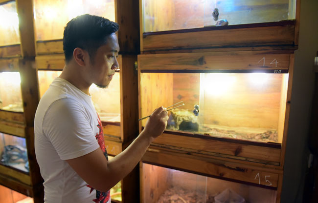 Nguyễn Việt Anh (Hà Nội) nổi tiếng trong giới chơi sinh vật cảnh Hà Nội nhờ sở hữu bộ sưu tập “thú cưng” độc đáo với đủ loại từ: rắn, trăn, ếch, rồng đất…