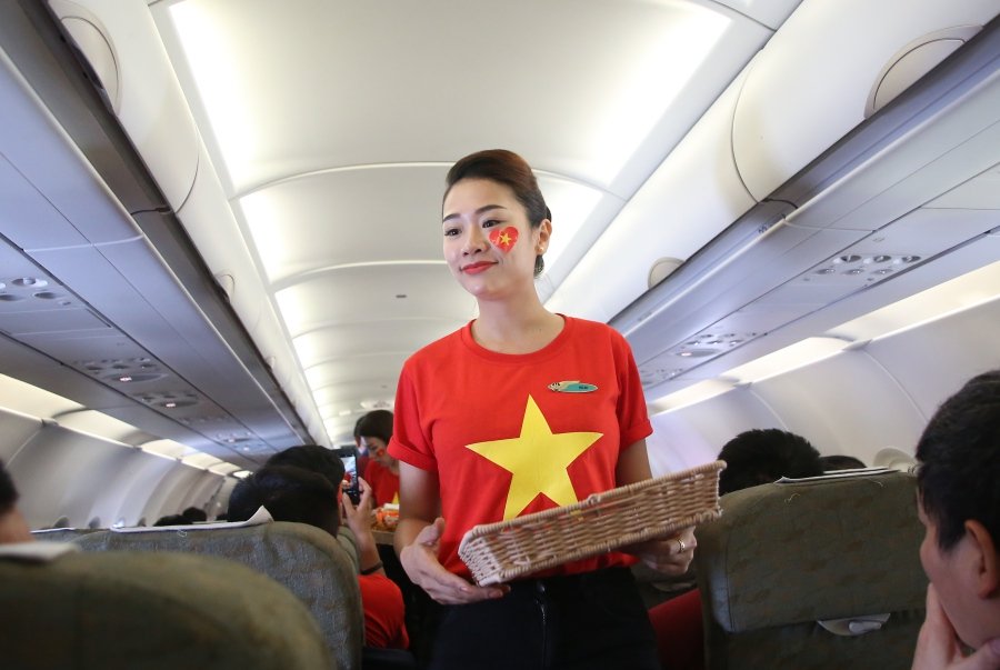 Tiếp viên Vietnam Airlins mặc áo cờ đỏ sao vàng phục vụ các cầu thủ U23 Việt Nam