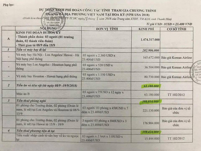 Thực hiện kế hoạch trên, ngày 28/8/2018, bà Trần Thị Thu Hằng - Giám đốc Trung tâm Xúc tiến Đầu tư Thương mại và Du lịch Thanh Hóa đã ký Văn bản số 247/TT-TCHC về việc thẩm định kinh phí tổ chức Đoàn công tác tỉnh Thanh Hóa tham gia Chương trình Quảng bá địa phương Việt Nam tại Hoa Kỳ gửi Chủ tịch UBND tỉnh Thanh Hóa có kèm theo phụ lục dự toán với số tiền lên đến trên 1,7 tỷ đồng.