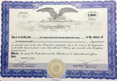 Giấy chứng nhận cho thấy Tín Thành là chủ sở hữu Tín Thành Oakwood Bank Corp. Ảnh từ Tập đoàn Tín Thành.