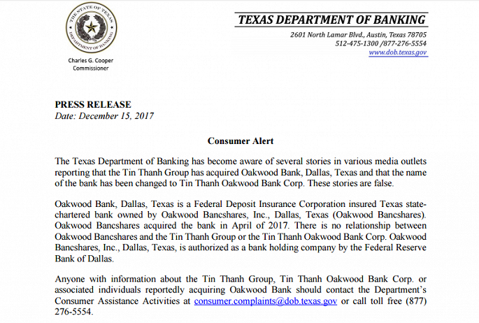 Tuy nhiên, theo tìm hiểu gần đây của phóng viên, cuối tháng 12/2017, cơ quan quản lý của Oakwood State Bank đã đưa ra cảnh báo: "Sở Ngân hàng Texas đã nhận được một số thông tin trên các phương tiện truyền thông khác nhau báo cáo Tập đoàn Tín Thành đã mua lại Oakwood Bank, Dallas, Texas và tên đó của ngân hàng đã được đổi thành Công ty Cổ phần Ngân hàng Tín Thành Oakwood Bank Corp. Thông tin này là sai sự thật ”.