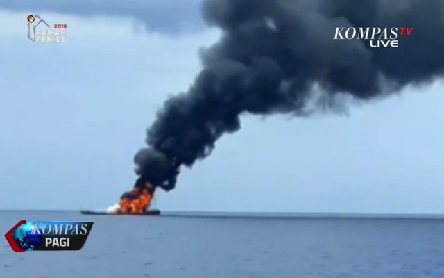 Các hình ảnh đảng tải trên kênh truyền hình Kompas TV cho thấy, lửa bao trùm toàn bộ con tàu trước khi nó bị chìm hẳn xuống biển vào đầu giờ chiều 11/9.