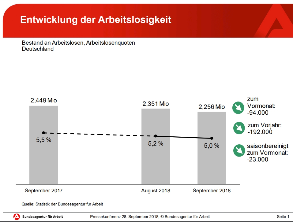 Theo báo cáo của sở lao động liên bang Đức ở Nürnberg. Tỷ lệ thất nghiệp giảm 0,2 phần trăm xuống còn 5,0 phần trăm.
