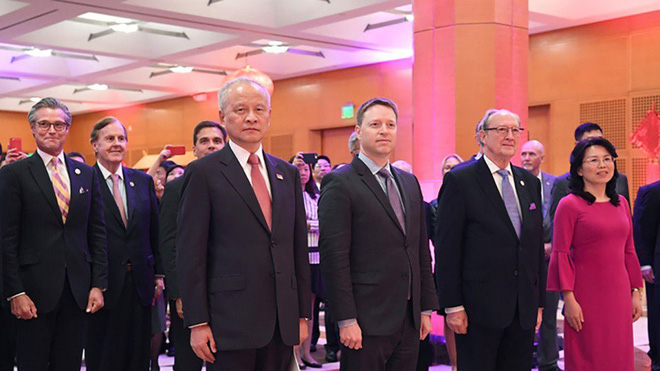 Ông Thôi Thiên Khải, Đại sứ Trung Quốc tại Mỹ (hàng đầu, bên trái) đứng cạnh ông Matt Pottinger, Giám đốc phụ trách các vấn đề châu Á tại Hội đồng An ninh Quốc gia Mỹ. Ảnh: ĐSQ Trung Quốc tại Mỹ.