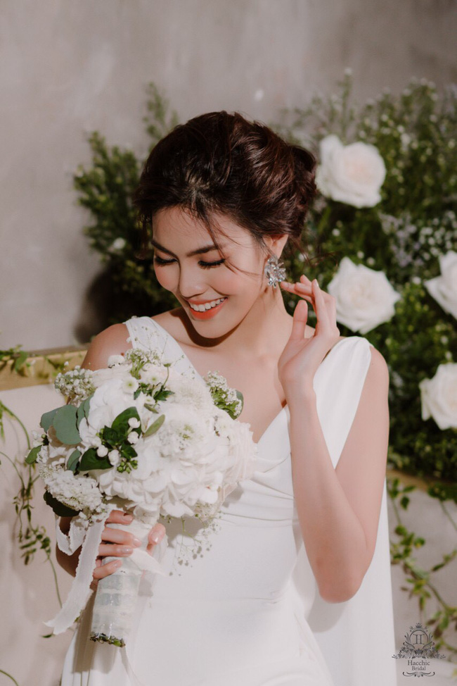 Hoa khôi Áo dài Lan Khuê hóa thân thành một quý cô đoan trang, cổ điển, thanh lịch khi diện thiết kế váy cưới trắng tinh khôi với phom dáng ôm tôn trọn lợi thế sắc vóc. Thiết kế còn lộng lẫy thướt tha hơn cả với hai dải lụa mềm mại rủ nhẹ hai bên vai.