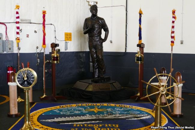 Tượng Tổng thống Ford (1913-2006) trong khoang chứa máy bay trên hàng không mẫu hạm USS Gerald R. Ford C̣n riêng bản thân tôi, tôi cảm thấy rất hănh diện và được vinh dự tham gia trong việc xây dựng hàng không mẫu hạm Gerald Ford.