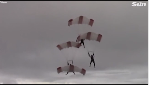 Nhưng gió mạnh đã cuốn hai người nhảy dù vào nhau, quay nhiều vòng trong không khí. Video cho thấy hai người này rơi tự do, cố gắng gỡ mình khỏi người kia để kéo dù dự trữ.