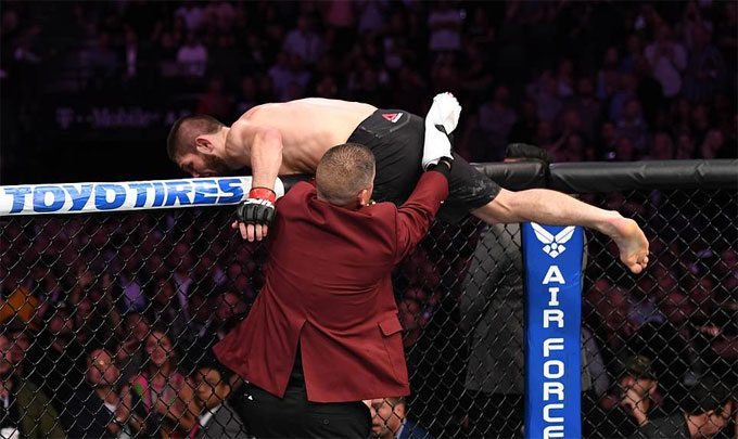 Dù đã dành chiến thắng, nhưng Nurmagomedov vẫn trèo ra ngoài làm điều khó hiểu. Anh đã tấn công đồng đội của đối thủ. Lực lượng an ninh đã phải can thiệp sự việc.