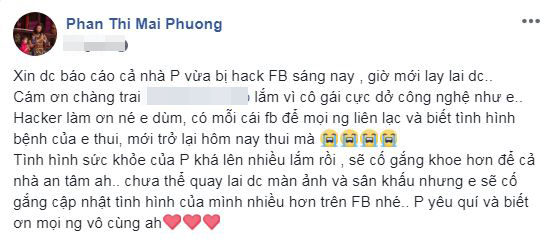 "Xin được báo cáo cả nhà Phương vừa bị hack Facebook sáng nay, giờ mới lấy lại được...Cám ơn chàng trai Thanh Minh Do lắm vì cô gái cực dở công nghệ như em. Hacker làm ơn né em dùm, có mỗi cái facebook để mọi người liên lạc và biết tình hình bệnh của em thui, mới trở lại hôm nay thui mà."