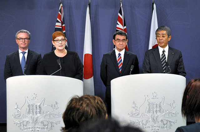 Chính quyền Thủ tướng Nhật Bản Shinzo Abe đang t́m cách mở rộng hợp tác song phương với Australia trong lĩnh vực an ninh hàng hải do Australia cũng quan tâm tới các hoạt động tại khu vực Thái B́nh Dương. Tại cuộc họp báo, Bộ trưởng Quốc pḥng Australia Christopher Pyne cho biết Australia hoan nghênh sự tham gia của Nhật Bản vào hoạt động pḥng vệ ở Thái B́nh Dương.