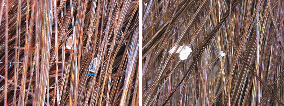 Chúng ta thường gặp phải bệnh trứng tóc xảy ra trên mái tóc (trứng tóc có thể xảy ra cả ở các bộ phận khác). Khi đó, những sợi tóc sờ vào thấy thô ráp, không mượt mà, có các hạt hình thoi màu nâu đen hoặc trắng đục bám quanh tóc, kích thước tới vài milimet, bám cách chân tóc từ 2 - 4 cm.