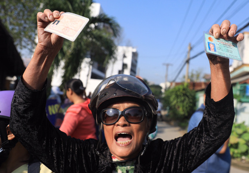 Không có giấy mời, người đàn bà trình CMND và thẻ cựu chiến binh nhưng cũng không được vào dự buổi làm việc. Ảnh: Hữu Khoa.