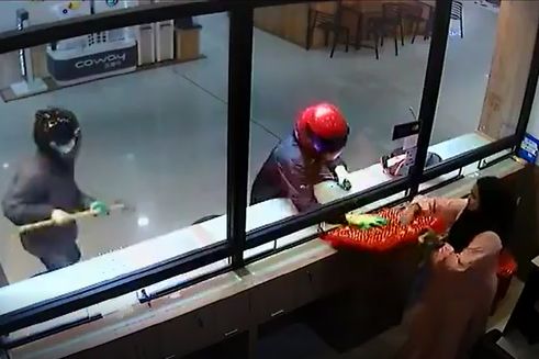 Hai tên cướp bịt mặt đã táo tợn tấn công tiệm vàng. Chúng dùng búa đập tủ kính để cướp đồ. Hành động của nhân viên bên trong cửa hàng khiến nhiều người thực sự choáng ngợp.