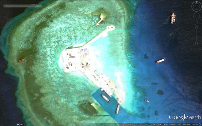Đá Gaven thuộc quần đảo Trường Sa bị Trung Quốc chiếm đóng và bồi lấp thành đảo nhân tạo, ảnh chụp tháng 10/2014 Ảnh: Google Earth.