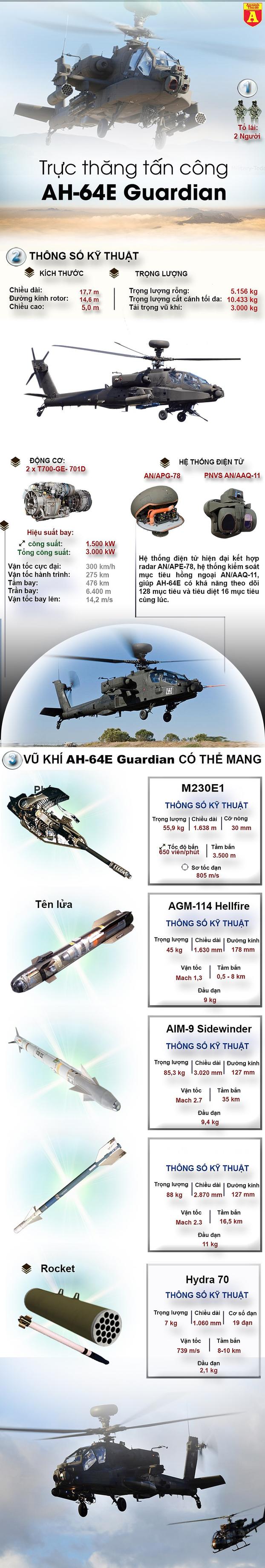 Với khả năng đạt tốc độ tối đa lên tới 300km/h khi bay thấp, tầm hoạt động xa, AH-64E Guardian chính là “mối hiểm họa“ đối với bộ binh và các phương tiện cơ giới của đối phương trong mọi điều kiện thời tiết, bất kể ngày đêm.