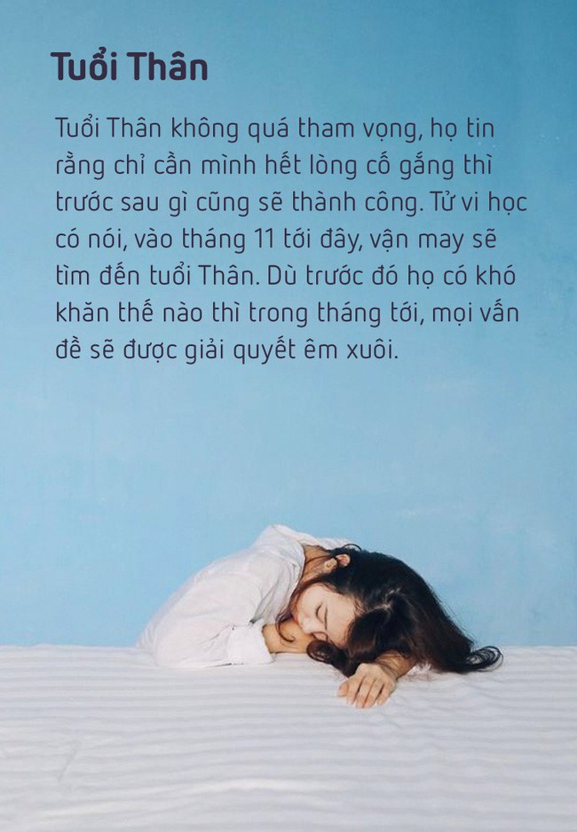 Tử vi học có nói, vào tháng 11 tới đây, vận may sẽ tìm đến tuổi Thân. Dù trước đó họ có khó khăn thế nào thì trong tháng tới, mọi vấn đề sẽ được giải quyết êm xuôi.