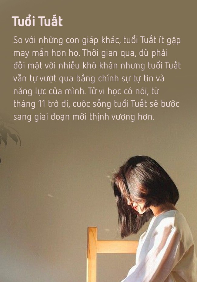 Thời gian qua, dù phải đối mặt với nhiều khó khăn nhưng tuổi Tuất vẫn tự vượt qua bằng chính sự tự tin và năng lực của mình. Tử vi học có nói, từ tháng 11 trở đi, cuộc sống tuổi Tuất sẽ bước sang giai đoạn mới thịnh vượng hơn.