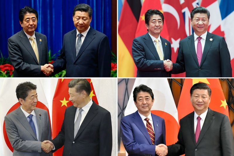 Quan hệ giữa ông Abe và ông Tập Cận Bình được "phá băng" theo thời gian. (Theo chiều kim đồng hồ, từ ảnh trên bên trái: 2014, 2016, 2017 và 2018. Ảnh: AP)