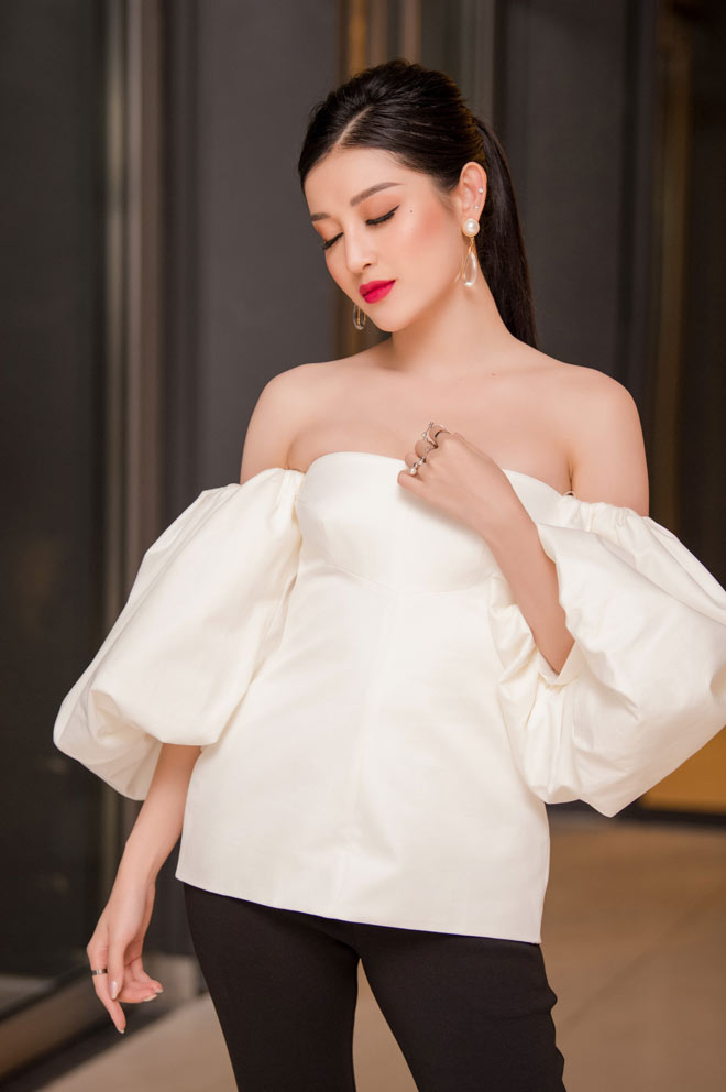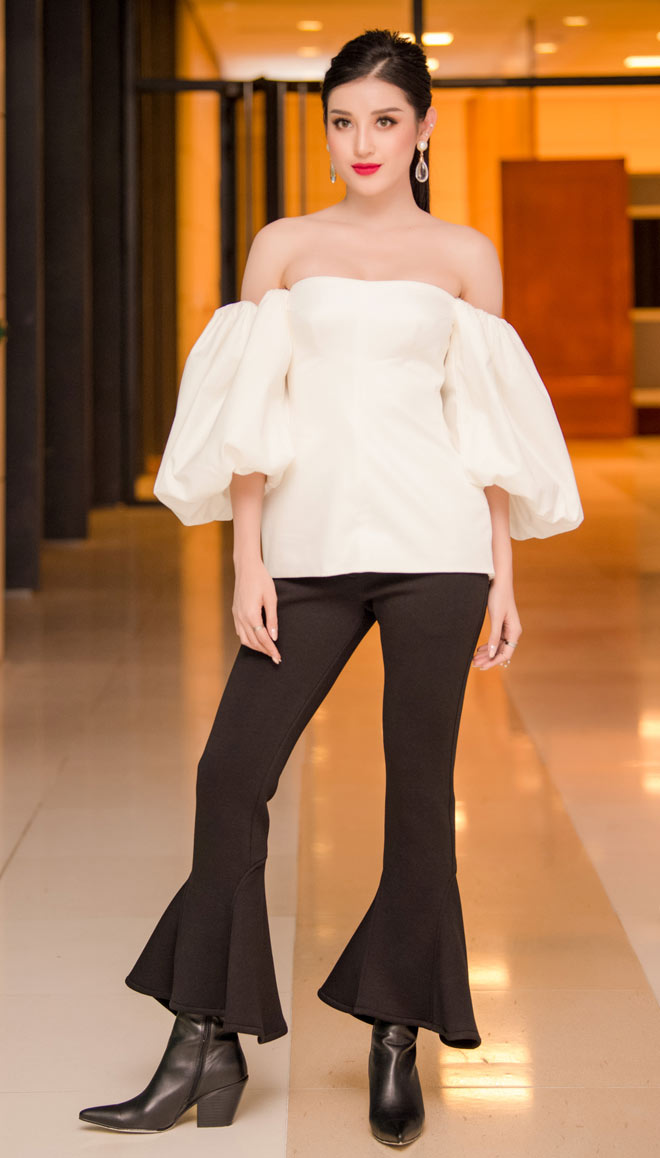Huyền My mặc áo trễ vai cùng quần ống vẩy đi xem thời trang