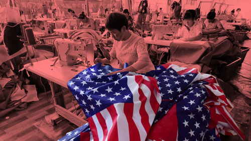 Công nhân may cờ Mỹ tại một nhà máy ở Trung Quốc. Ảnh: Reuters.