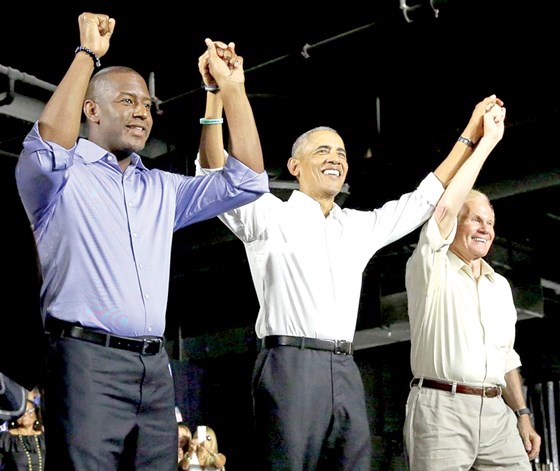 Cựu Tổng thống Barack Obama (giữa) và ứng viên đảng Dân chủ tranh cử Thống đốc bang Florida Andrew Gillum (trái) trong cuộc vận động tranh cử ở bang này