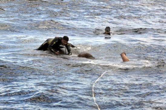 Với sự trợ giúp của những sợi dây thừng, nhóm hải quân đã từ từ kéo con voi trở lại bờ.
