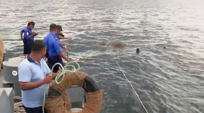 Mặc dù voi có khả năng bơi lội tuyệt vời, nhưng rõ ràng là con vật không thể tự cứu mình. Điều may mắn là những người lính hải quân đã xuất hiện và không ngần ngại giải cứu con vật.
