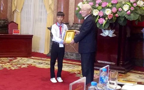 Ngay sau đó, Hiếu đã được Phòng GD&ĐT, Sở GD&ĐT Hà Tĩnh, Bộ GD&ĐT tặng giấy khen, bằng khen. Vinh dự lớn hơn là vừa đây, em được Tổng Bí thư - Chủ tịch nước Nguyễn Phú Trọng gặp mặt thân mật và tặng ảnh Bác Hồ.