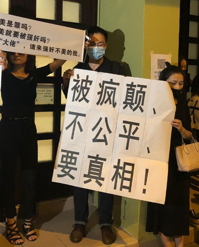 Một số người khác căng tấm biển với nội dung Lam Khiết Anh bị hại tới mức hóa điên. "Không công bằng, cần sự thật", tấm biển ghi.
