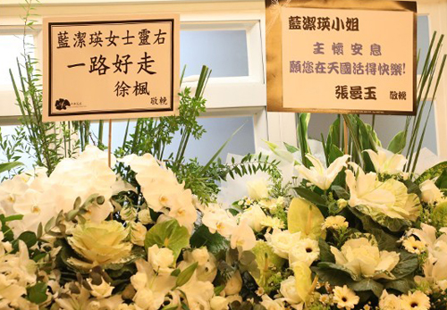 Trương Mạn Ngọc - diễn viên gia nhập TVB cùng thời Lam Khiết Anh - gửi hoa viếng (phải). Tấm bảng giấy gắn trên hoa ghi dòng chữ: "Chị Lam Khiết Anh, mong chị sống vui vẻ nơi thiên quốc".
