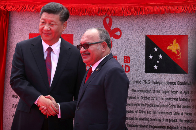 Thủ tướng Papua New Guinea Peter O'Neill bắt tay Chủ tịch Tập Cận Bình tại lễ khánh thành Đại lộ Độc lập do Trung Quốc tài trợ ở Port Moresby ngày 16/11. (Ảnh: Reuters)