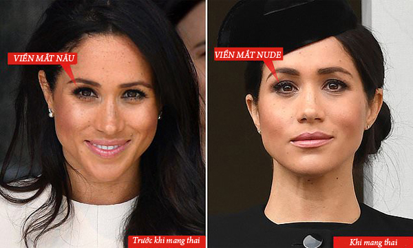 Meghan có mẹo trang điểm giấu đi sự mệt mỏi khi mang bầu. Meghan thay đổi cách trang điểm rất tinh tế để che giấu vẻ mệt mỏi trên khuôn mặt. Meghan vẫn trung thành với phong cách trang điểm tự nhiên mà chỉ thay đổi một chút ở đường kẻ viền mắt dưới.