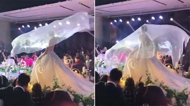 Được biết, “khăn voan bay" đang là một cơn sốt trong các đám cưới ở Trung Quốc. Khi cô dâu đứng trên sân khấu, giữa tiếng nhạc vang lên, tấm khăn voan sẽ bay trong không khí cùng với ánh sáng và hiệu ứng hình ảnh.
