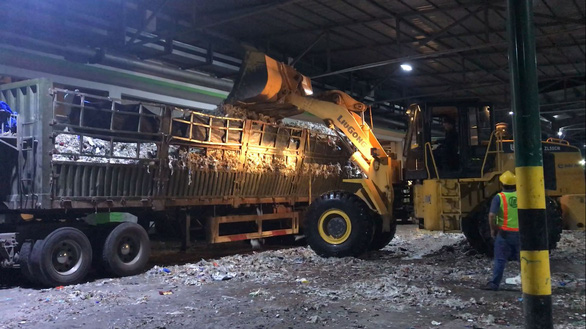 Xe ben mang biển kiểm soát 51D-310… đang được xe máy xúc múc từng gầu rác lên xe tại bãi tập kết huyện Nhà Bè, TP.HCM - Ảnh cắt từ clip