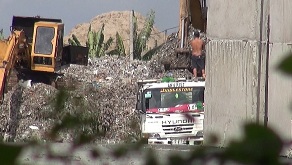 Khoảng 16h ngày 12-8, tại một bãi rác khổng lồ, lộ thiên ven đường Nguyễn Hữu Thọ (xã Long Thới, huyện Nhà Bè, TP.HCM), xe ben 10 tấn mang biển số 51D-310... đang được máy xúc múc từng gầu rác thải đổ lên thùng xe.