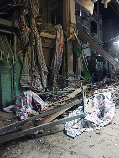 Sống trong hẻm, chị Ngân (30 tuổi) cho biết sự cố gây tiếng động rất lớn, nhiều người hoảng loạn tri hô. Giàn giáo, bêtông, vật dụng ngổn ngang. Bên trong căn nhà có tiếng kêu cứu.