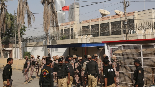 Lực lượng an ninh Pakistan tại lãnh sự quán Trung Quốc ngày 23/11. Ảnh: AP
