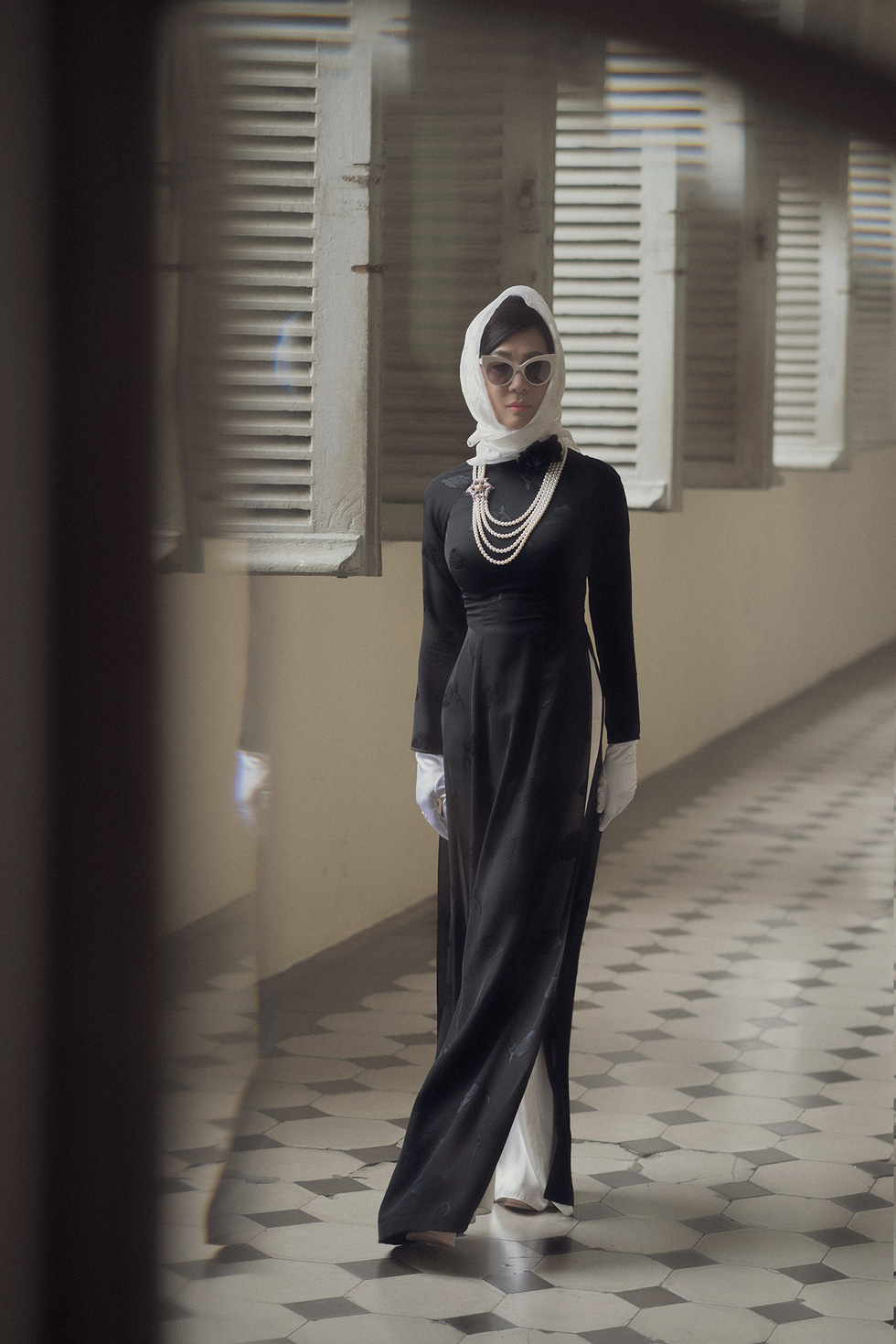 Áo dài của Võ Việt Chung còn đi kèm những phụ kiện như găng tay, kính vintage, trang sức ngọc trai… để phỏng dựng đúng giai đoạn thời trang có sự ảnh hưởng của phương Tây.
