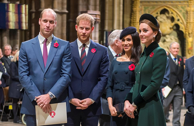 Meghan hiện ở trung tâm của sự chỉ trích sau tin đồn hai cặp vợ chồng hoàng gia lục đục được lan rộng từ cuối tháng 11. Trong ảnh, William, Harry, Meghan và Kate dự sự kiện tưởng niệm 100 năm kết thúc Thế chiến I tối 11/11 tại Tu viện Westminster. Ảnh: UK Press.