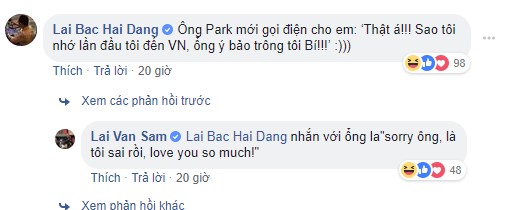 Đáng chú ý, ở phần bình luận phía dưới status của nhà báo Lại Văn Sâm chính là câu nói trêu đùa hài hước từ cậu con trai – MC Lại Bắc Hải Đăng. Nam MC thường ngày vẫn hay gọi bố là “anh Sâm” trong công việc ở đài truyền hình Việt Nam. Trong cuộc gọi tưởng tượng với HLV Park Hang Seo, Lại Bắc Hải Đăng nói lại với bố: “Ông mới gọi điện cho em hỏi: ‘Thật á, tôi nhớ lần đầu tôi đến Việt Nam, ông ấy bảo tôi trông bí’. Thế là sao”.