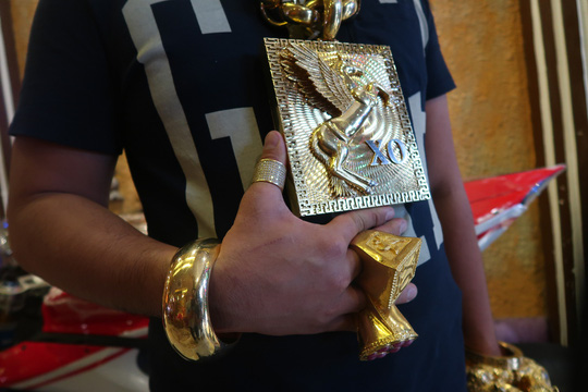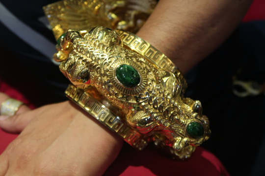 Anh Phúc tiết lộ trên người anh đeo khoảng 13 tỉ đồng và vàng đều tính ký. Cụ thể, anh Phúc đeo 4 chiếc nhẫn, mỗi chiếc nửa kg, sợi dây chuyền 5 kg và 2 chiếc vòng 5 kg, mặt thắt lưng cũng bằng vàng. Ngoài ra, anh Phúc đang làm chiếc nón 1 kg vàng gần 27 lượng vàng.