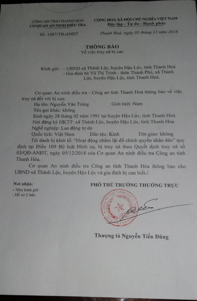 Công an tỉnh Thanh Hoá, là nơi cha mẹ của anh Nguyễn Văn Tráng đang sinh sống, đã đưa ra quyết định truy nã anh vào ngày 05/12/2018. Văn bản này được cho là đã gửi về cho gia đình anh ở xã Thành Lộc, huyện Hậu Lộc, và chính quyền địa phương.