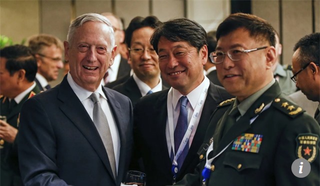 Từ trái qua phải: Bộ trưởng Quốc phòng Mỹ Jim Mattis, Bộ trưởng Quốc phòng Nhật Bản Itsunori Onodera và Trung tướng Trung Quốc He Lei gặp nhau tại Đối thoại an ninh Shangri-La ở Singapore hồi tháng 6. (Ảnh: AP)