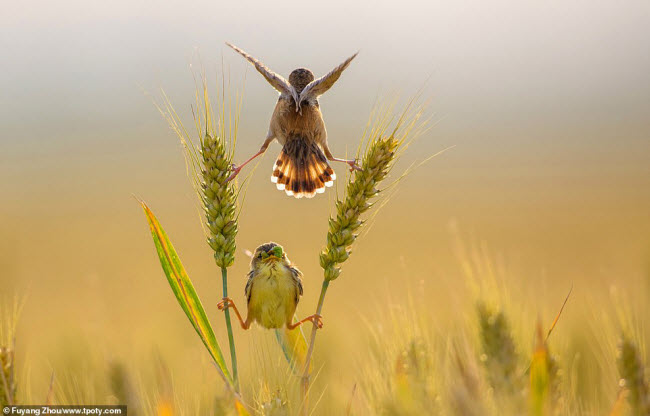 Chim sẻ mẹ mớm thức ăn cho chim non ở Trung Quốc. Ảnh: Fuyang Zhou