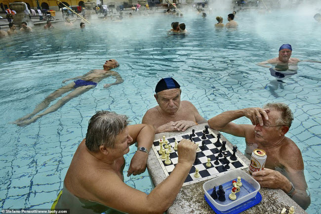 Những người đàn ông chơi cờ và thư giãn dưới bể bơi Széchenyi Baths được xây dựng từ năm 1913 ở Budapest, Hungary. Ảnh: Stefano Pensotti